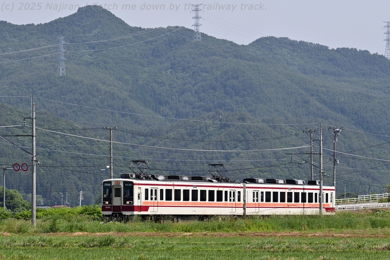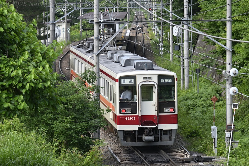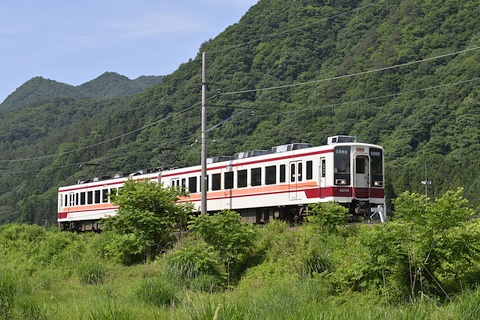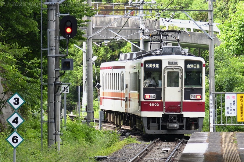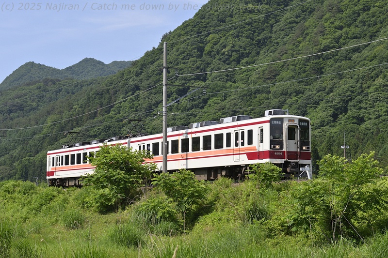 △ 野岩鉄道会津鬼怒川線 804レ 新藤原行。モハ61103+クハ62103(後追い)、上三依塩原温泉口。[2025-06、栃木県日光市上三依]