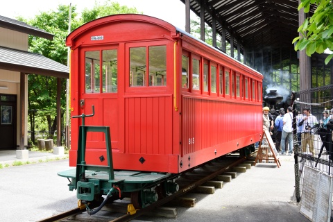 2016年秋に修復が完成した木曽森林鉄道大形B型客車の展示が、今回の森林鉄道まつりの目玉の一つです。ポスターでは、ホイットカム社製ガソリン機関車が牽引する姿を見られるかもと期待されましたが、残念ながらホイットカムの調子が今ひとつで実現しませんでした。