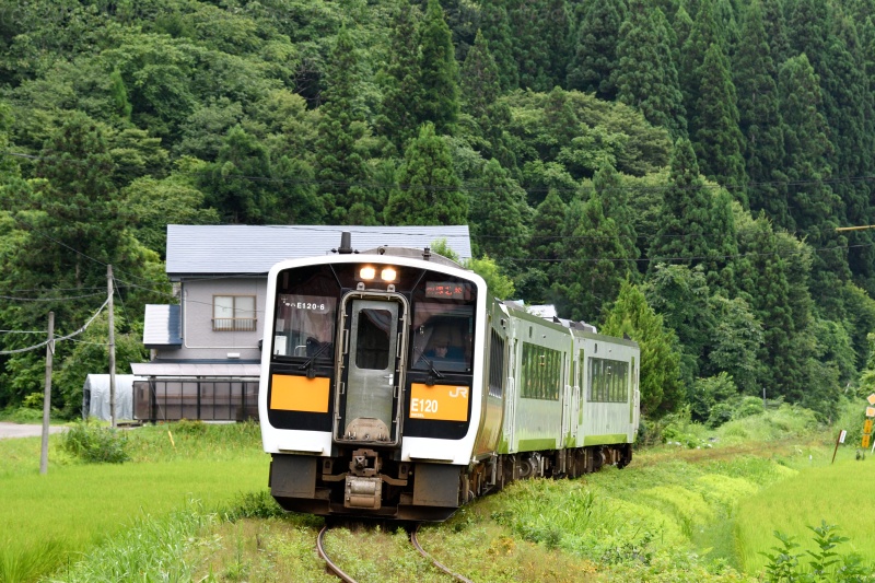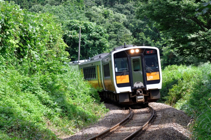 車体側面のオレンジ色のストライプとオコジョのラッピングが印象的なキハE120は、製造された8両すべてが新津運輸区に配置され、キハ110系と共通運用で新潟地区で活躍してます。導入は2008年で、これにより米坂線の国鉄形気動車(キハ40、キハ47、キハ48、キハ52、キハ58)の運用を置き換えました。先に製造が開始されたキハE130系気動車(3扉車)から中央の客用扉を無くして2扉とした車両で、キハE130系と同様に450PS/2000rpmのエンジン、変速1段・直結4段、自動式のトランスミッションを搭載した高性能車で、新潟トランシス製です。