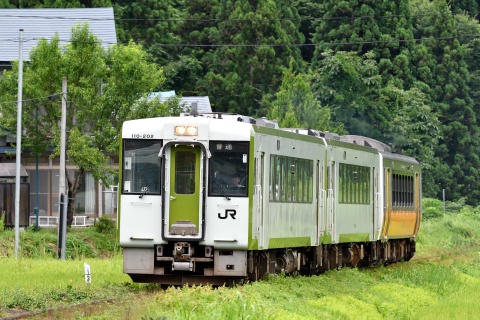 磐越西線の非電化区間を受け持つ新津運輸区には、200番台を中心に22両のキハ110系が配置され、普通列車や快速あがのに使用されています。キハ110系200番台の特徴は、それまでプラグドア(ドアが閉まるとき、最後に車体外側に向かってドアをはめ込む動作を行う)から引き戸への変更、それに伴いドアの高さを少し低くしたこと、などです。なお、新津運輸区のキハ110系は後述するキハE120形と共通運用で、磐越西線、信越本線、白新線、羽越本線、米坂線の各線で走る姿を見ることが出来ます。
