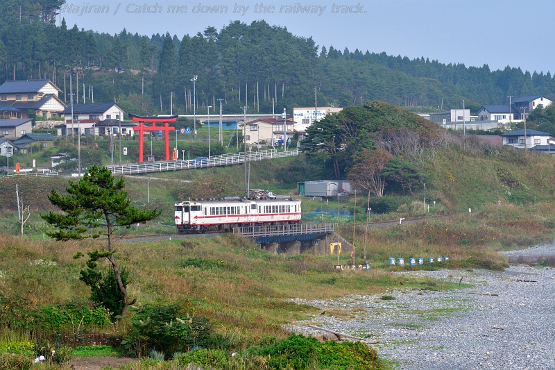 岡谷稲荷神社の鳥居のある吹切集落を背景に、大浜川の橋梁を渡る八戸行の列車。