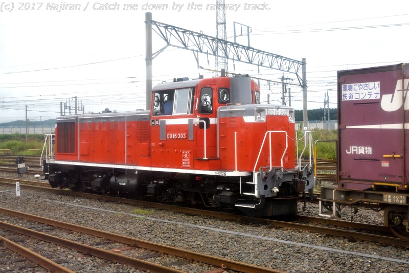 DD16は軌道の弱いローカル線の蒸気機関車置き換え用に開発された、軸重の軽い小型のディーゼル機関車で、 飯山線や大糸線の除雪の使用するため、両端に脱着式の単線用ラッセル式除雪ヘッドを取り付け可能に改造され、4両が300番台となりました。 しかしローカル線の貨物輸送廃止や除雪形態の変化に伴って用途を失い多くが廃車される中、DD16 303は機関車部分だけが八戸臨海鉄道に譲渡されました。