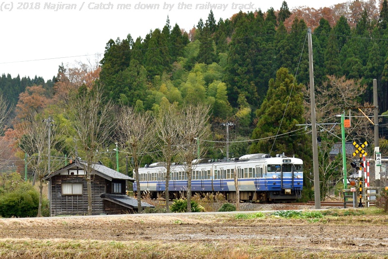 越後線が電化されてからずっと走り続けてきた115系電車にも、いよいよ引退の時期が近づいてきました。 越後線のこの辺りは、東頚城の丘陵地帯に沿って里山の風景の中を走る区間です。 細い道路沿いのトネリコの木が、今日も新潟色の115系を見送ります。