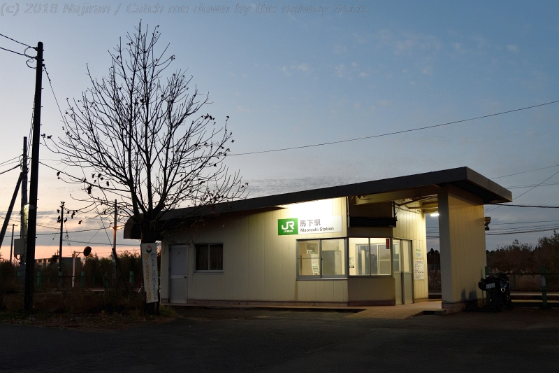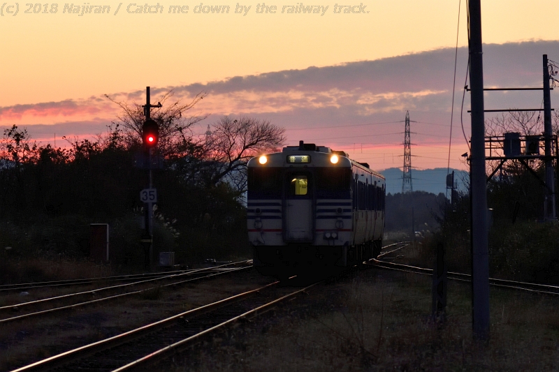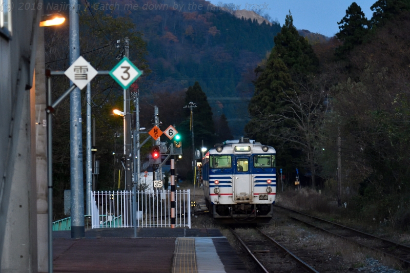馬下駅を発車して山岳地帯に向かう上り列車に、後ろから照らす弱い光、名残の青空と夕闇が交錯します。