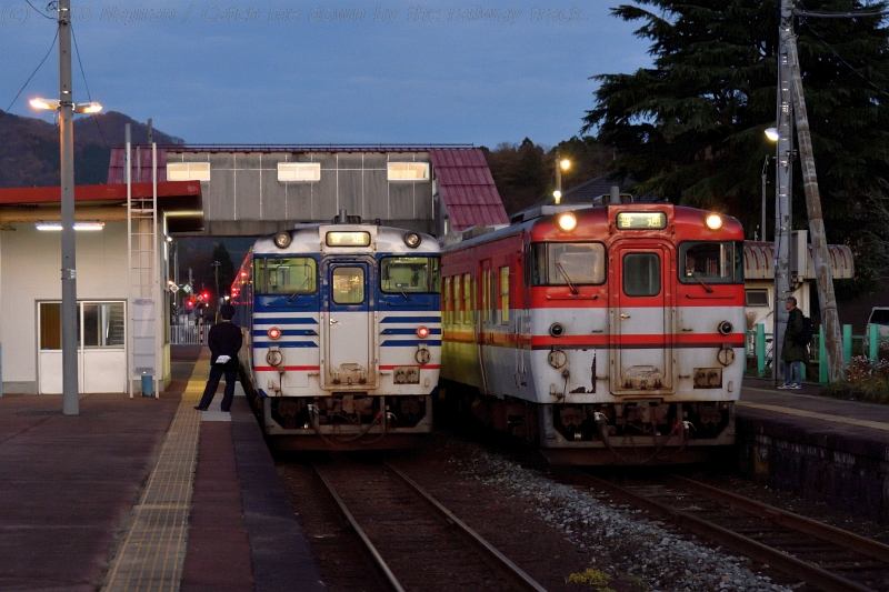 夕焼雲からの淡い光に照らされながら馬下駅で交換する、会津若松行と新津行のキハ47です。
