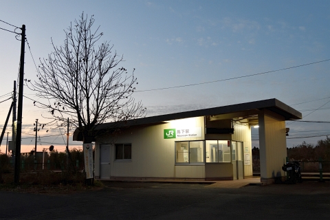 夕焼けをバックに馬下駅に到着する会津若松行の列車です。