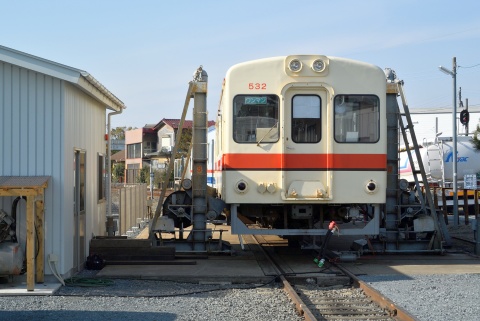竜ケ崎駅構内側線の一番端にはキハ532が台車を外されて点検中でした。 キハ532は国鉄から譲渡されたキハ20系の部品を使用して1981年に新潟鐵工所で新造された車両ですが、冷房化改造、機関をDMF13HZに換装済みで、きれいに塗装されてこの先も活躍が期待できそうです。