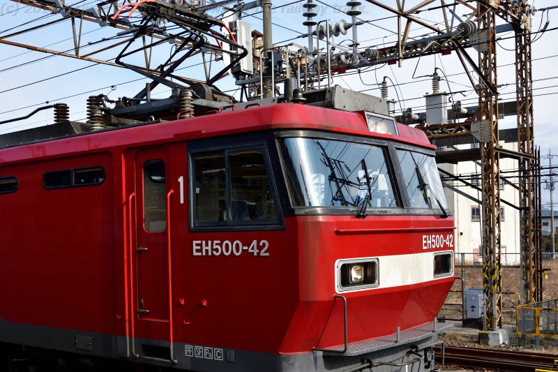 △ 交直切換断路器の横を通過する上り貨物列車、EH500-42、黒磯駅構内。 [2018-02、栃木県那須塩原市]