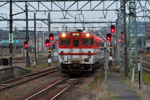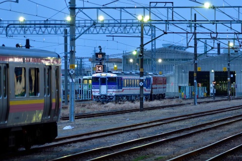 新津駅5番線の西側には留置線群があり、新津運輸区に出入りする車両もここを通ります。 遠くから蒸気機関車の汽笛が聞こえてきました。 新潟駅の立体化工事の関係で今シーズンから始発駅を新潟から新津に変更し、3月31日に初日を迎えるSLばんえつ物語の運転準備をしていたのかもしれません。 そうこうするうちに列車遅延の案内放送が入り、車両故障と車両交換で10分ほど遅れて磐越西線会津若松行の気動車が新津運輸区を出区しました。