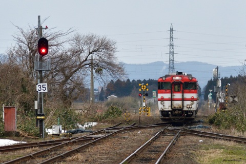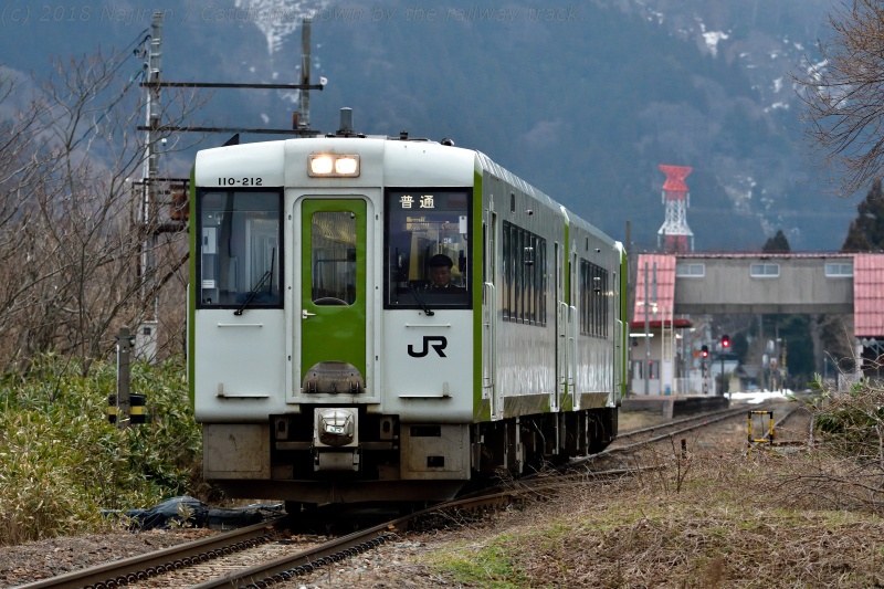 新津から会津若松へ向かう磐越西線の平野部の端に馬下(まおろし)駅があり、新津側から馬下で折り返す区間列車が朝・夕を中心に設定されています。 雪深い山間部に入る前に、ここで朝の区間列車を撮影することにしました。