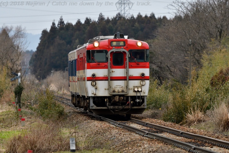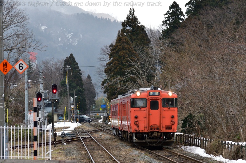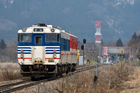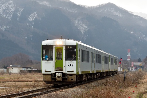 会津若松を5:28に発車する始発の下り列車です。 磐越西線ではキハ110とキハ120の運用は共通のようでこの列車にもキハ120が混ざることがありますが、この日はキハ110系だけのきれいな編成でやってきました。