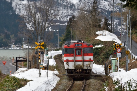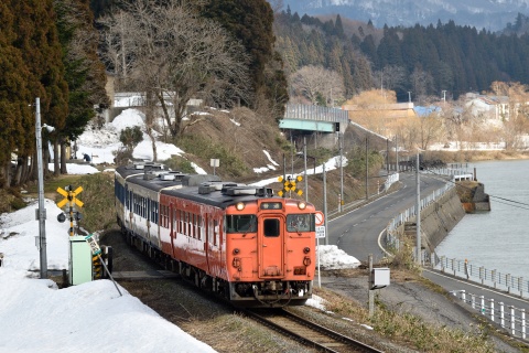 この辺りの阿賀野川は下流にある揚川ダムの湛水域になっていて、時折りボートがゆったりした川面を行き来します。京ノ瀬集落に近い踏切付近より。