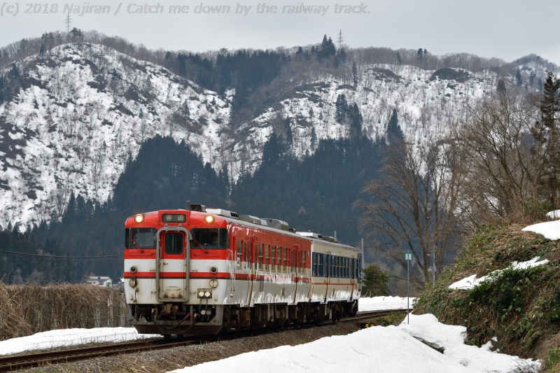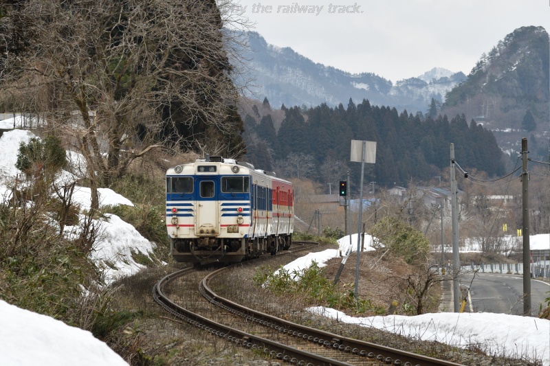 餅山、愛宕山方面の山々をバックに、津川駅に進入する下り列車です。 この方向は、西会津に向かって400~500mの山々が連なります。