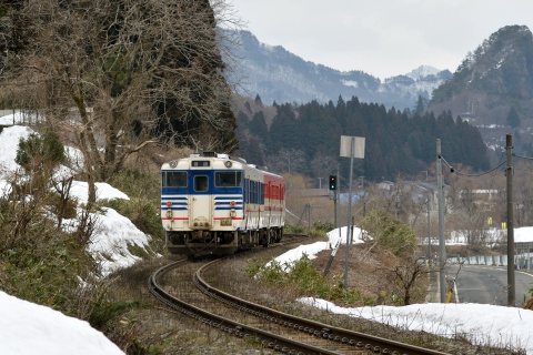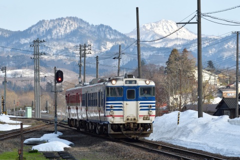 快速あがのの到着を待って発車した新津行下り列車。行く手には、阿賀野川沿いに標高400mほどのピークがそびえます。