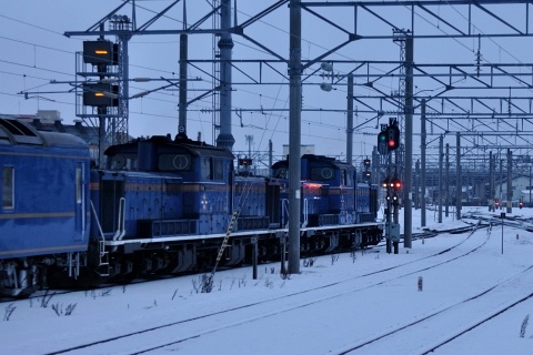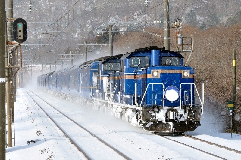 列車内で暖まっていた体がだんだん冷えて来た頃、雪煙を上げながら北斗星がやってきました。小雪が舞っていますが陽もさしていて、まずまずのコンディションでした。