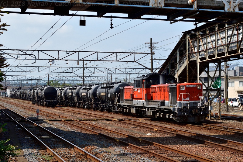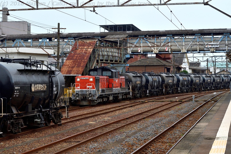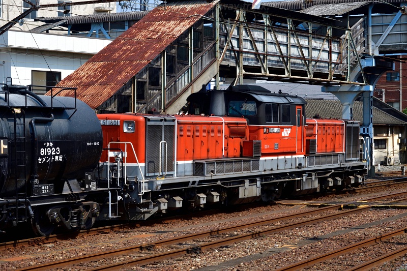 富田駅には、三岐鉄道が以前旅客輸送を行っていた頃の跨線橋とホームが残っていますが、今は閉鎖されていて入れません。 跨線橋へ続く階段横で発車時刻を待つDD51 1801を、JRのホームから撮影しています。