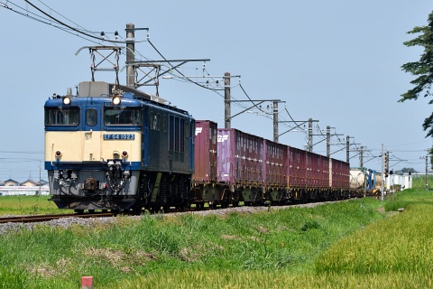 貨物時刻表によればこの列車の新小岩(信)発は4:42、鹿島サッカースタジアム着は7:15で、途中の通過時刻を読むのは容易ではありません。 念のためだいぶ早めにスタンバイしたつもりでしたが、それで正解でした。 一緒に撮影した方の話では佐原駅でだいぶ長い間停車するらしく、下総神崎付近の通貨時刻は思っていたより早かったです。