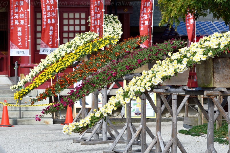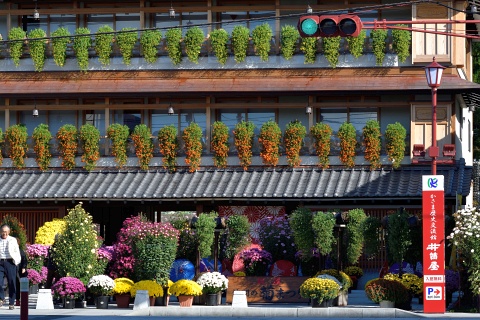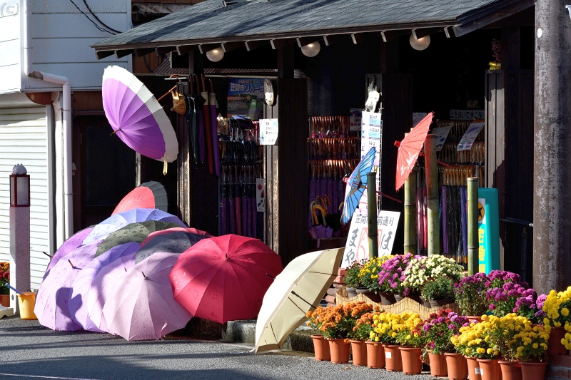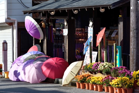 菊の花と傘の花のディスプレイは、門前通りにある「ほんまや」さん。 雑貨、お饅頭、お漬物などを売るお土産屋さんです。
