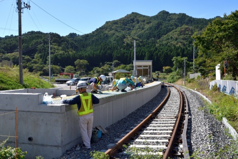 浪板海岸駅のホームでは、新しく打たれたコンクリートの上に、滑り止めや誘導用ブロックを張る作業が進められていました。