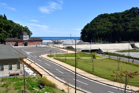 津波からの一次避難場所に指定されている島越駅前高台付近(駅西側)より、きれいに整備された島越駅周辺と海を望みます。 松前川が作った谷地形を白いコンクリート構造物の築堤が横切っていて、線路はその堤頂に敷かれています。 島越駅前高台(写真を撮った場所)の地盤高は20mです。