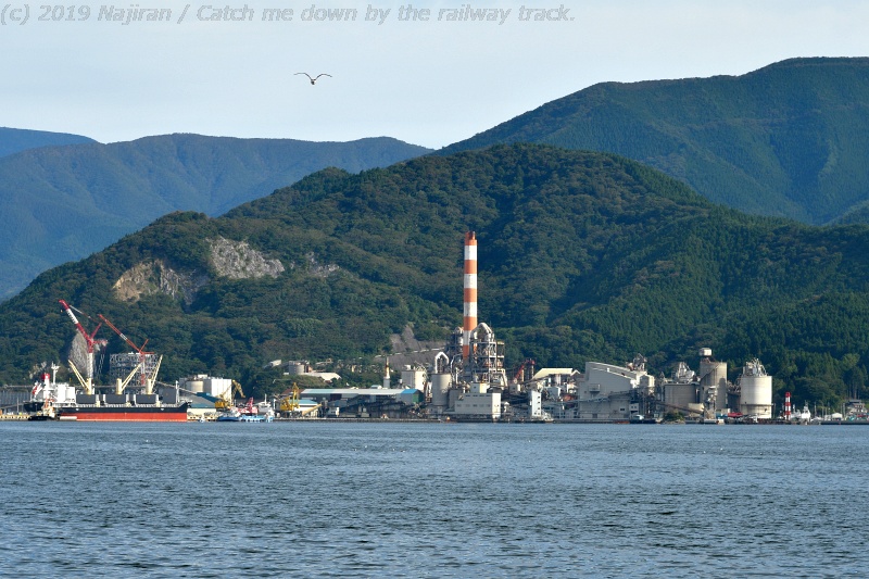 赤崎駅を発車し次第に速度を上げる列車を、佐野橋に近い踏切付近から望遠で撮影しています。 セメント工場のある赤崎駅方面には、資材を輸送するベルトコンベアやホッパなどの施設が遠望できます。