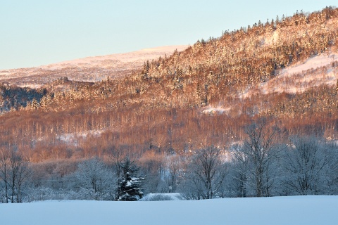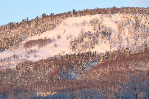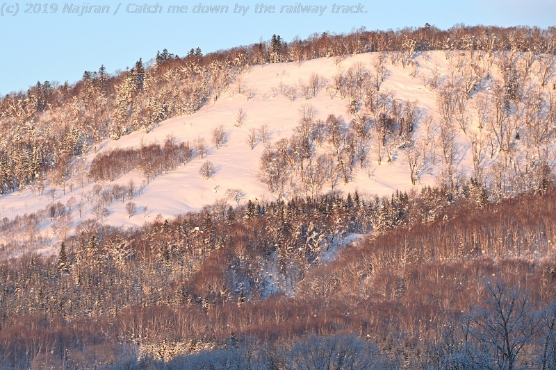 2008年の1月、最初に仁宇布を訪ねた時、ダイヤモンドダストを初めて見ました。 今回も期待して行ったのですが、最低気温は-15°Cでダイヤモンドダストには少し届かなかったようです。 金星が輝く夜明け前から外に出て、次第に明けてゆく空を見ながら2時間くらい歩いたでしょうか。 仁宇布の盆地を囲む入布山、部落山が朝陽に赤く輝き、次第に明るさを増して朝の景色に変わるまで、ピンと張りつめた空気の中で厳冬の山里歩きを楽しみました。