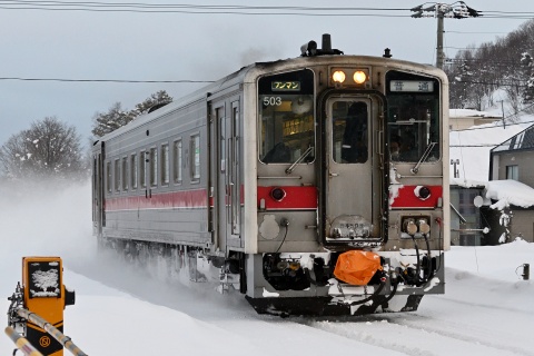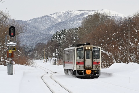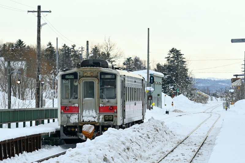 前夜から新雪が少し積もり、10分遅れてやってきた翌朝の上り一番列車は雪煙を上げて通過していきました。
