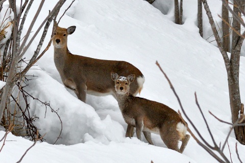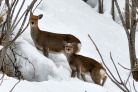 ポンピラ温泉に荷物を置いて駅との間にある森林公園に戻り、特急サロベツを待ちました。 除雪された道路から逸れて、公園内はカンジキを付けて跨線橋までアプローチです。 道北の雪とは思えないくらい湿っていて、新潟のカンジキが良く効いて快適でした。 時折り、エゾシカが顔を出します。
