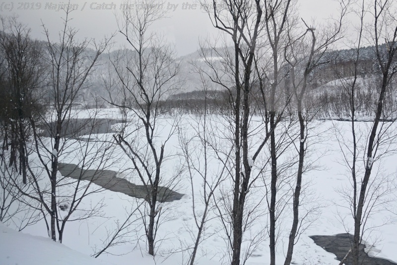 この日は、美深から宗谷本線を北に向かいました。 音威子府から先は、左手に天塩川を眺めながら景色の良い区間を走行します。 この時期の天塩川はほぼ結氷していますが、時々顔を見せる流れが渦を巻いてまた氷の中に吸い込まれる様は圧巻です。