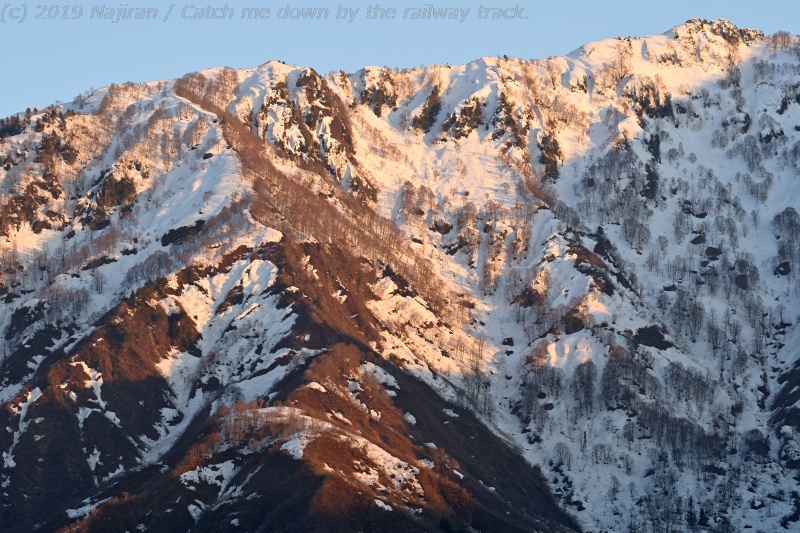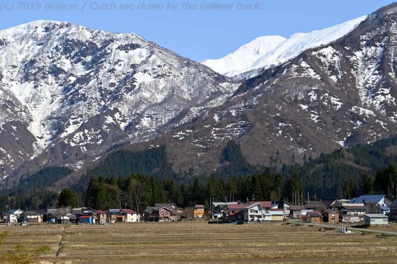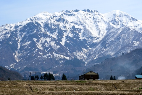 南魚沼市宮にある五十沢(いかざわ)温泉ゆもとかんからの景色です。左手前が大割山、奥に見える真っ白い山は巻機山です。