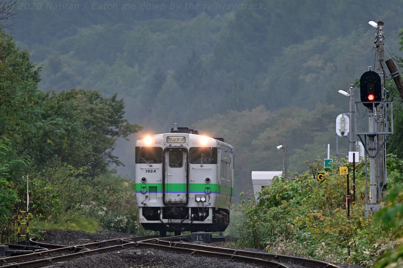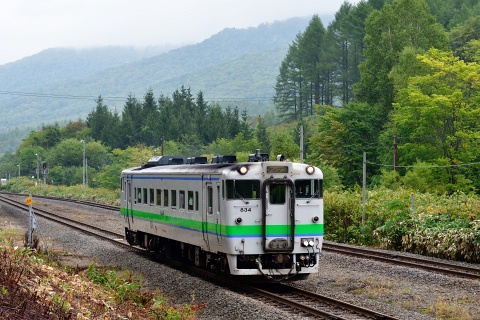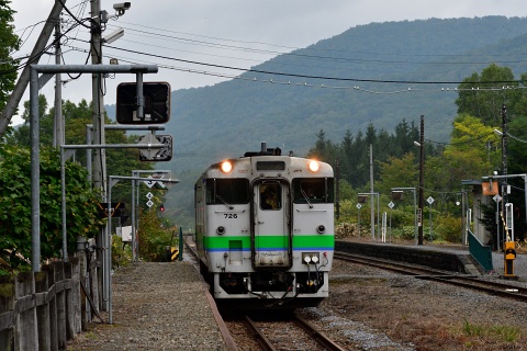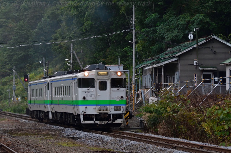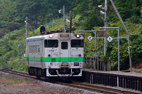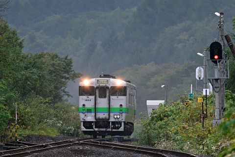 和寒から続く長い上り勾配を登り、天塩川・石狩川分水嶺の塩狩駅に進入する快速なよろ。 快速なよろは旭川ー名寄間に4往復運転されていますが、塩狩駅に停車するのは4号、5号(上り下りそれぞれ1本づつ)です。