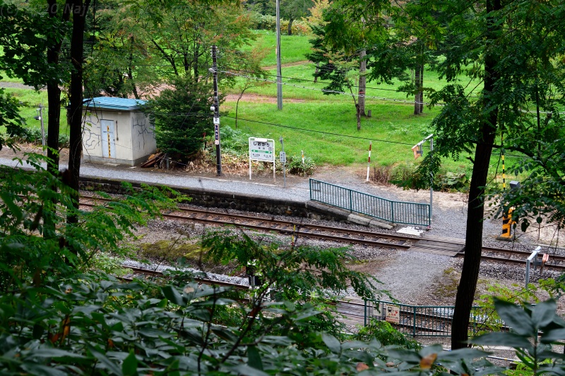 塩狩駅前の高台にある塩狩峠記念館の裏手から。駅名標が建っているのは、2番線のホームです。
