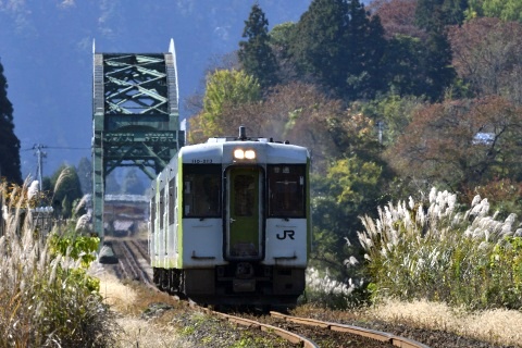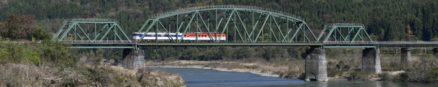 バナーは、磐越西線日出谷-鹿瀬間の阿賀野川深戸橋梁を渡る下り列車です。