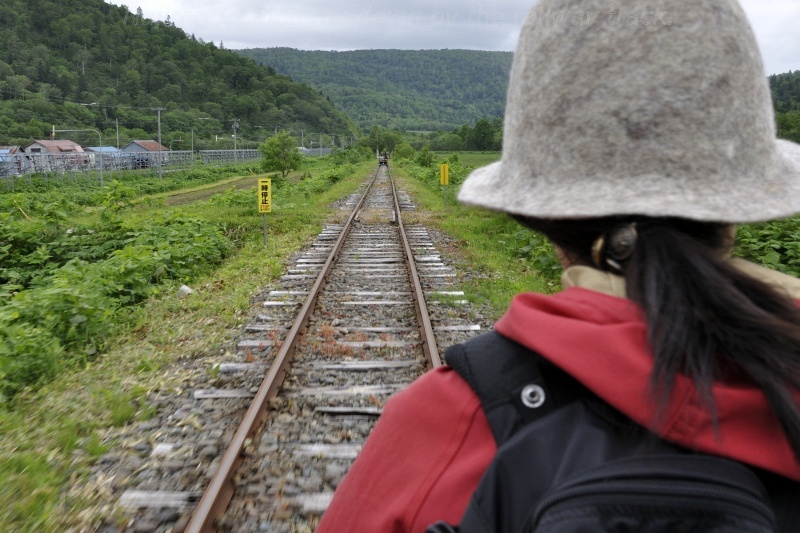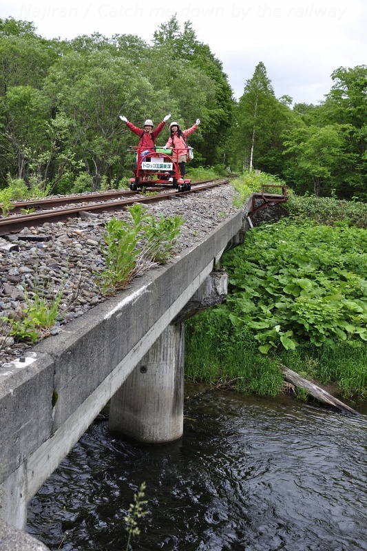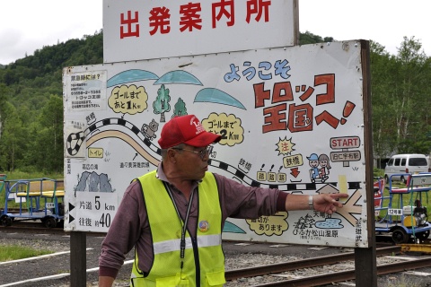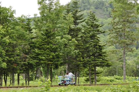仁宇布の中心からほぼ南西へ 5km、新緑の林や採草地の中を旧国鉄美幸線の線路が続きます。「途中に踏切がありますがトロッコは止まって左右確認して進んでください」という案内係りの説明を聞き、いよいよトロッコに乗り込みます。