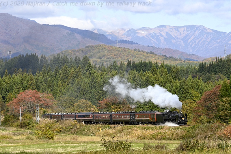 △ 磐越西線 8226レ 快速ばんえつ物語、会津若松行。C57180ほか、上野尻-野沢。[2019-11, 福島県耶麻郡西会津町]