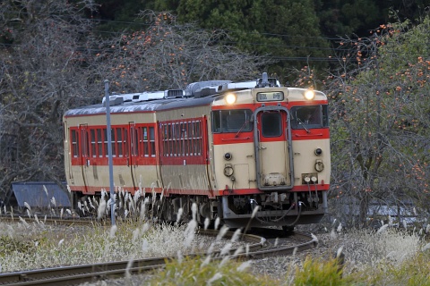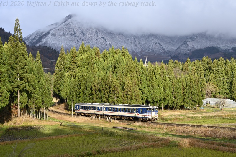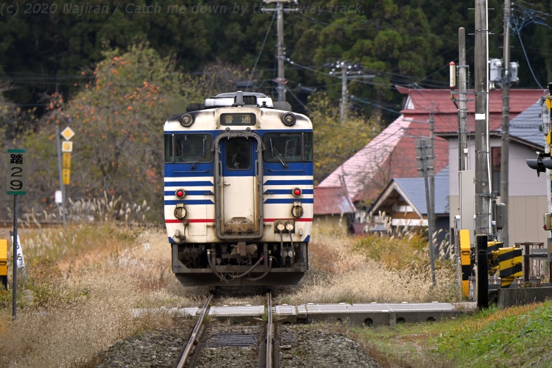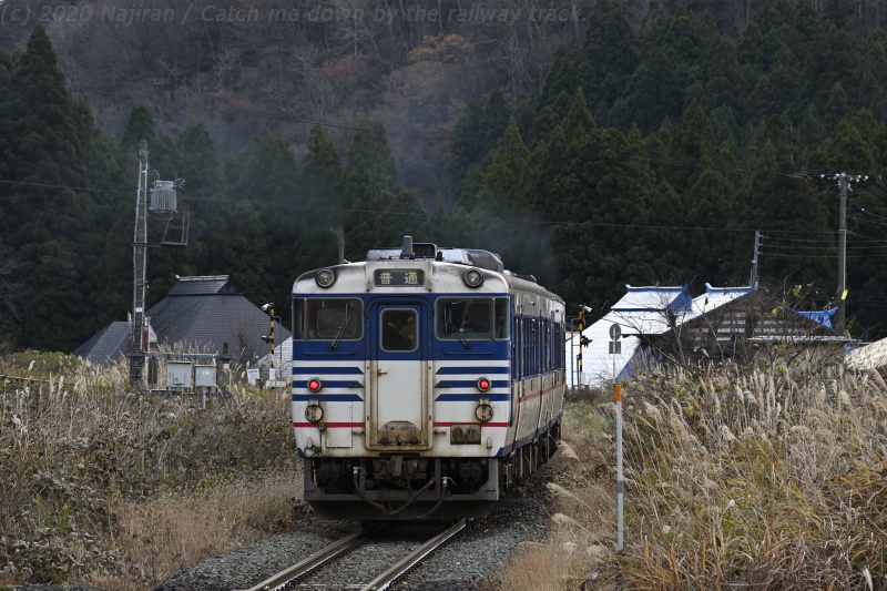 △ 磐越西線 9228D 臨時快速 磐越西線国鉄急行色旅情。キハ48523 + キハ471514、鹿瀬-日出谷。[2019-11-30, 新潟県東蒲原郡阿賀町]