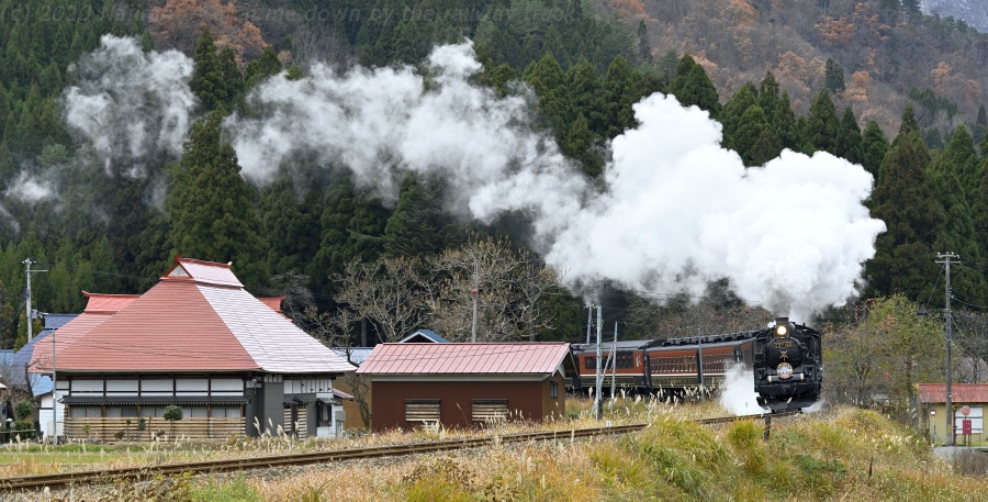 △ バナーは磐越西線 8226レ 快速ばんえつ物語 C57180ほか。鹿瀬-日出谷。[2019-11-30, 新潟県東蒲原郡阿賀町]