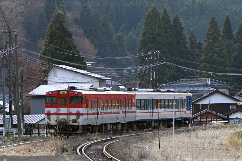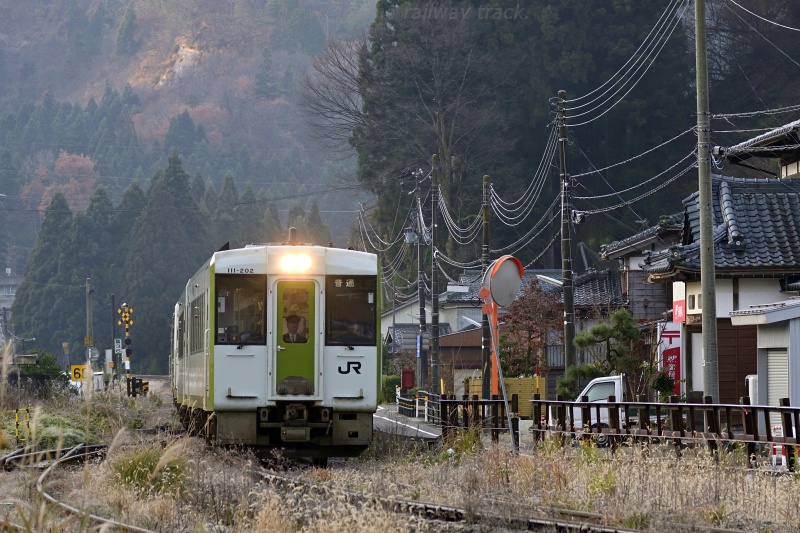 五十島駅で停車中の221D。 この日の編成は中間にキハE120を挟んで、←新潟:キハ111 + キハ112 + キハE120 + キハ110 + キハ110 の5両編成です。