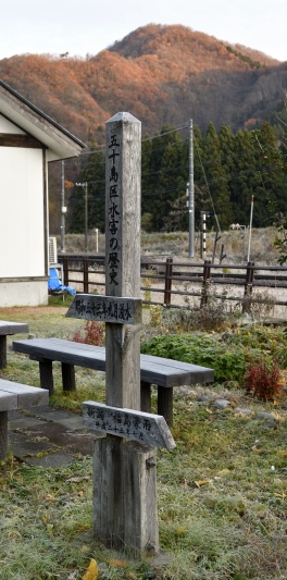 五十島駅のすぐ裏には、阿賀野川が蛇行して流れます。 五十島集落は過去に何度か水害の被害を受けており、駅のはずれには代表的な水害の水位を示す木標があります。 駅の裏に回ると、駅よりはるかに高い場所に阿賀野川の堤頂がありました。