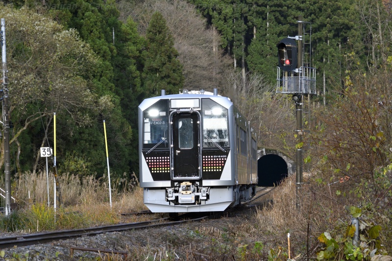 磐越西線は五十島駅からいったん阿賀野川本流を離れ、支流の五十母川を渡り吉津トンネルに入ります。 この日のハイライトは、トンネルに向かい力行する快速ばんえつ物語です。
