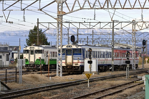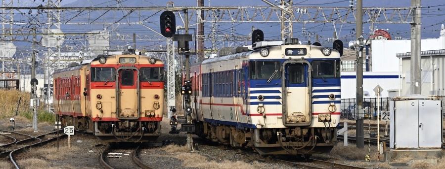 △ 磐越西線 9223D 臨時快速 磐越西線国鉄急行色旅情 新津行。キハ471514 + キハ48523(左、後追い)、キハ471521ほか(右)、会津若松駅。[2019-12, 福島県会津若松市]