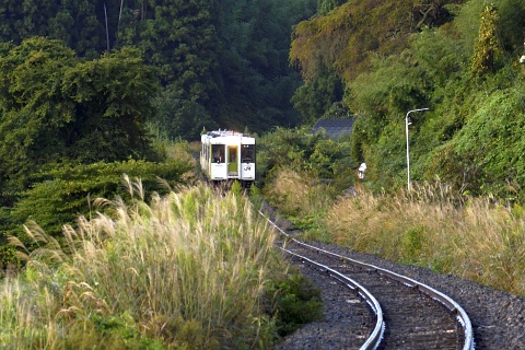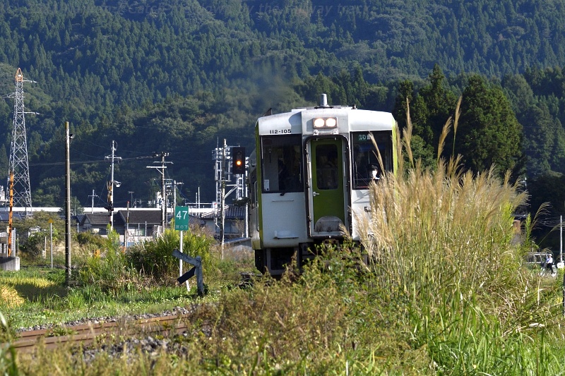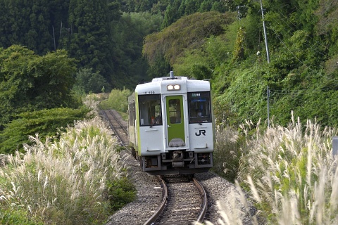 ススキが目立つ緩い登り坂を神俣駅に向かって力行する気動車。小野新町駅1番線の郡山方に夜間滞泊していた編成です。