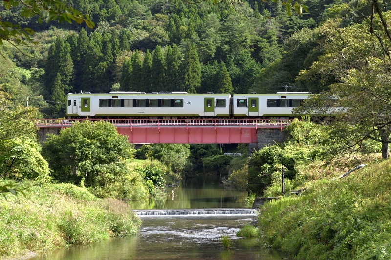 小野新町駅で始発列車を見送った後は、磐越東線沿いの国道を神俣駅から江田駅に移動しながら、山間農地や渓谷を行く列車を撮影しました。