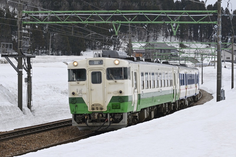 只見線(小出-只見間)に走っている気動車の送り込み回送列車です。 最初の写真ともども、話には聞いていましたが時刻は調べて行かなかったので、いきなり気動車が来て驚きました。 何故か、新津運輸区と郡山車両センターの車両の混成です。