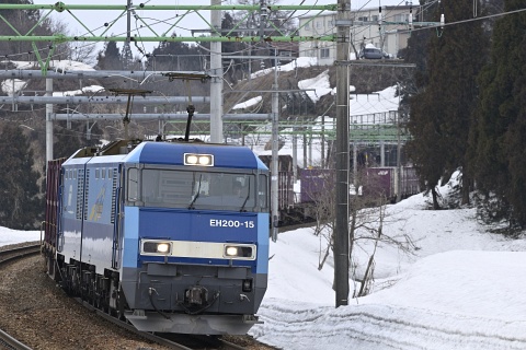 コンテナの中身は、鉄道貨物発着がある新潟市内の北越紀州製紙からの紙製品でしょうか。 上りの高速貨物列車は、天王トンネルを抜け丘陵の裾をまくように牛ケ島地区へ向かいます。