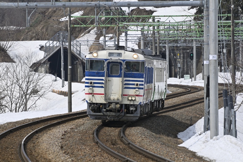 天王トンネルを出て越後川口方面に向かう、只見線(小出-只見間)への送り込み回送列車です。列車の左側には、下り線のスノーシェッドの入口が見えています。