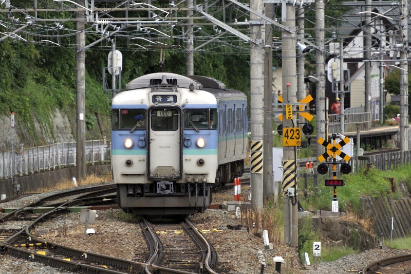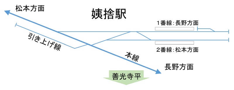 長野行きの普通電車は、1番線に到着します。 出発する時は、推進で渡り線を通って一旦引き上げ線に停車。その後向きを変えて本線を長野方面へ下っていきます。 写真は、引き上げ線から本線に出た3523Mです。