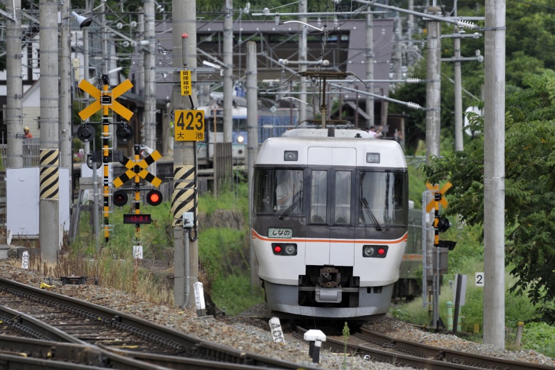 松本方面から長野方面へ、姨捨駅ホームには入らずに本線を通過する特急しなのです。後ろには、姨捨駅2番線に停車中の1222Mが見えます。