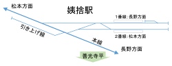 篠ノ井線の姨捨駅はスイッチバックの駅として有名で、日本三大車窓に選ばれるなど景色の良い所としても知られています。 快速リゾートびゅうふるさとを姨捨駅で下車し、線路端からスイッチバックの様子を写真に収めました。 サイドバーに姨捨駅の配線図を置きましたので合わせて御覧ください。
