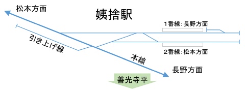 松本方面からの普通電車が姨捨駅に到着します。